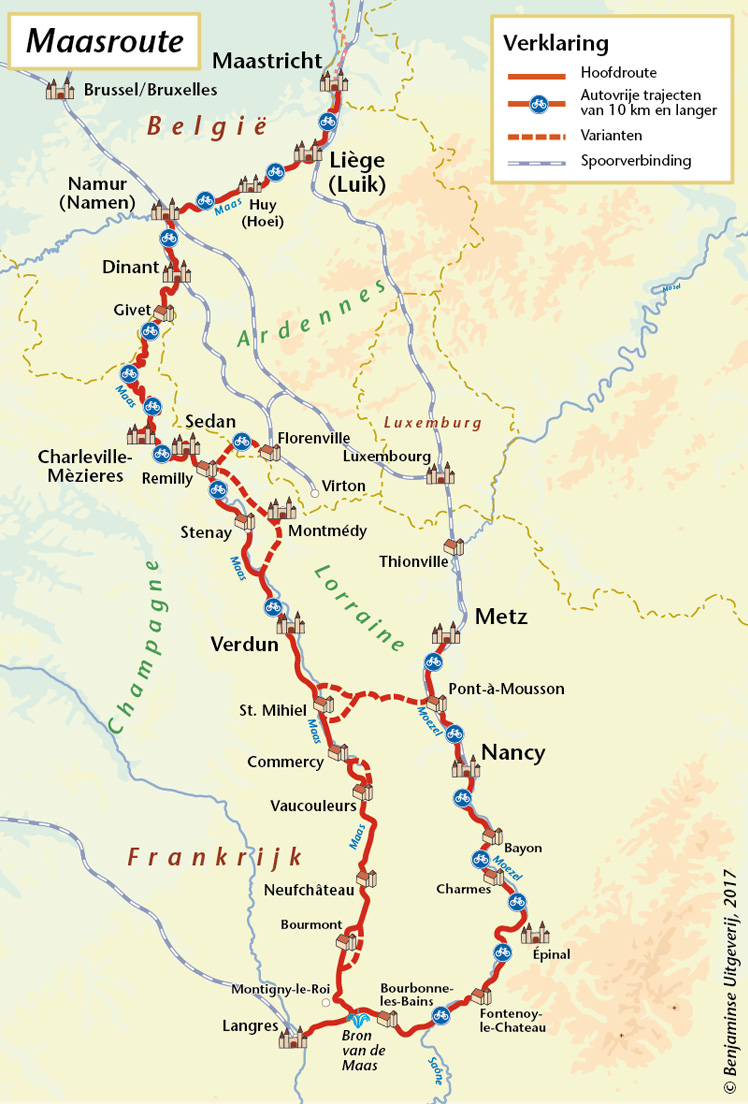 Het lijkt even Holland maar bij het witte dorp Thorn weet je toch weer zeker dat het echt Limburg is. De Maasroute kent hier een Belgisch en een Nederlands deel. Deze gids geeft de keus om beide te volgen. Beide varianten komen in ieder geval weer samen bij Maastricht. Maastricht is hele gezellige stad met een prachtig historisch centrum. Hierna is het nog maar kort stukje langs de wijngaard op de Pietersberg en dan zijn we in België. Luik is de laatste jaren herboren en leeft weer. Het oude industriegebied er omheen ziet er nog steeds vervallen uit, maar het is slechts een tiental kilometers dat je hier doorheen moet voordat het groen langs de dalwanden de boventoon voert. Bovenlangs de Maas tref je meerdere vestingen aan die de rivier en haar stadjes verdedigden zoals Hoei, Namen, Dinant en Givet. Onderaan de vestingen liggen de stadjes zelf met gezellige pleinen, terrasjes en restaurants. Na Dinant volgt stroomopwaarts het mooiste deel van de Maas tot Charleville-Mezières waar de machtige stroom haar bedding diep door de Ardennen heeft uitgeschuurd. Nog verder stroomopwaarts kom je langs de vestingstad Sedan en het stadje Verdun dat ondanks onmetelijke verliezen aan beide zijden door de Fransen werd bevochten en behouden tijdens de Eerste Wereldoorlog. Er zijn meerdere monumenten die hier aan herinneren.In de bovenloop is de Maas een meanderende beek langs het geboortedorp van Jeanne d’Arc. Hoe dichter je bij de bron komt hoe meer het Maasdal zich opent, maar aan de randen vindt je uitgestrekte bossen.