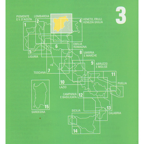 Onze aanbevolen kaartserie voor Italië. De kaarten van Touring Club Italiano, met een schaal van 1:200.000, zijn het meest betrouwbaar en hebben het prettigste kaartbeeld. Uitstekend geschikt om zelf fietstochten mee uit te zetten of als begeleidende kaart van bestaande routes. Alle verharde wegen en deels ook de onverharde zijn aanwezig.