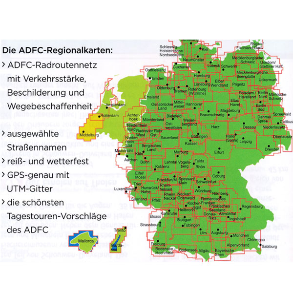 Dit is de meest geschikte fietskaart wanneer u wat langer in één regio verblijft. De kaart is van de ADFC (Algemeine Deutsche Fahrrad Club). Echt alle relevante fietsinfo is op deze kaart terug te vinden. Het is één van onze favoriete fietskaarten. Door de prettige helderheid en alle fietsinfo is het een lust voor het oog... en voeding voor fantasie en het verlangen natuurlijk.