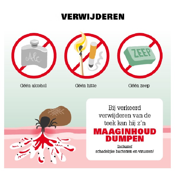 Als je een tekenbeet ontdekt, is het belangrijk om de teek binnen acht uur te verwijderen zonder deze te verdoven of te verhitten, omdat dit het risico op besmetting vergroot.