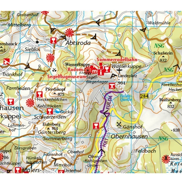 Radeln in der Rhön. Die Fahrradkarte umfasst das Gebiet Bad Hersfeld, Bad Salzungen, Schlitz, Hünfeld, Tann, Meiningen, Fulda, Gersfeld, Schlüchtern, Bad Neustadt, Grabfeld, Bad Brückenau, Bad Kissingen, Bad Königshofen, Hammelburg, Gemünden, mit Werra, Fulda, Haune, Ulster, Sinn und Fränkischer Saale.