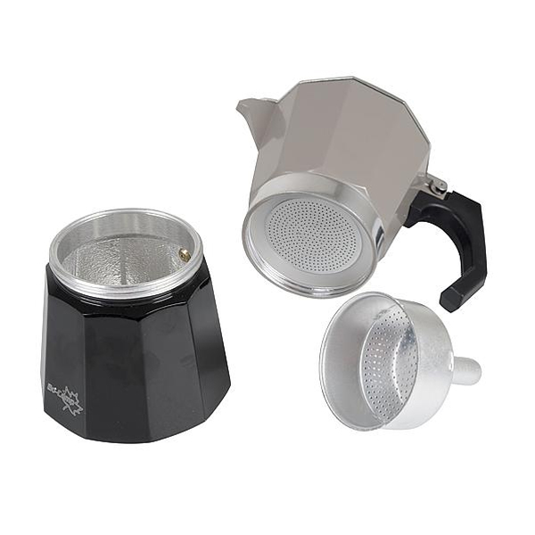 Een stevige aluminium koffiezetter. Deze eigentijdse espresso maker is goed voor 6 kopjes koffie. Met deze percolator kan er binnen enkele minuten een heerlijke kop koffie worden gezet. Je vult het onderstel van deze espresso maker met water en daarboven in het houdertje komt de koffiepoeder. Wanneer het water aan de kook raakt, ontstaat er een heerlijke kop koffie. Op de espresso die eruit komt valt echt niets af te dingen. Gun u zelf een lekker bak.