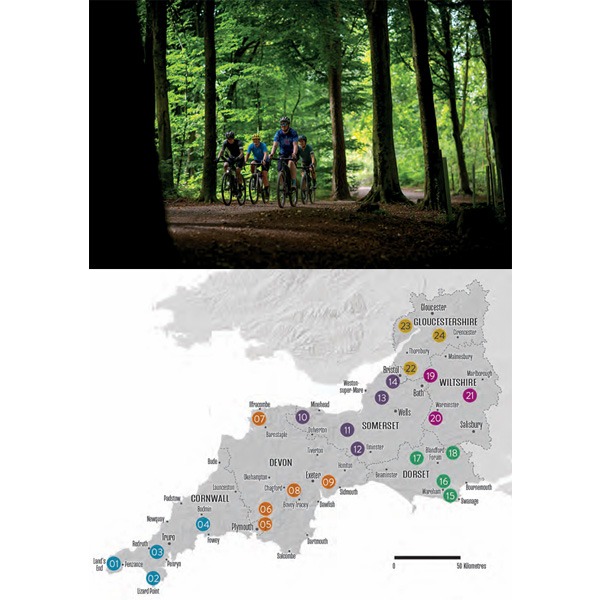 Fiets over mijnpaden en grindpaden langs de kust in Cornwall, afgelegen paden op Dartmoor, maak een tocht langs theehuizen in Exmoor in Noord-Devon en Somerset, rijd over vuursteen- en krijtpaden op de Old Chalk Way in Dorset, glooiende grindwegen op Salisbury Plain in Wiltshire en paden langs de overblijfselen van oude tramlijnen en kolenmijnen in het Forest of Dean in Gloucestershire.