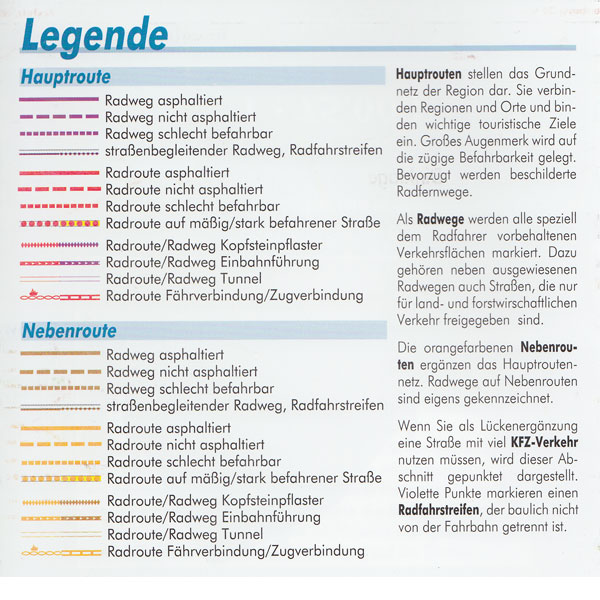 Wir haben für Sie ein dichtes Netz an Radrouten und Radwegen recherchiert, das es Ihnen ermöglicht, die gewählte Region intensiv mit dem Fahrrad zu erleben. Neben den wichtigsten Radfernwegen sind in der Karte noch zahlreiche zusätzliche Langstreckenverbindungen eingezeichnet, so dass ein ausgewogenes Hauptroutennetz entsteht. Das Hauptroutennetz wird zudem verdichtet durch ein sinnvoll ausgewähltes Nebenroutennetz. Diese Kombination aus Haupt- und Nebenrouten ermöglicht es, eine Region auf Tages- oder Mehrtagestouren zu entdecken oder das Gebiet auf einer längeren Radreise auf angenehm fahrbaren Wegen zu durchqueren. Neben der detaillierten topografischen Karte enthält die Radkarte noch zahlreiche andere hilfreiche Informationen. Die Legende erklärt Ihnen alle in der Karte enthaltenen Informationen sehr anschaulich: Radinformationen, touristische Informationen, topografische Informationen sowie die Maßstabsangabe mit Maßstabsleiste. Stadt- und Ortspläne von den wichtigeren und größeren Städten und Ortschaften der Region erleichtern die Orientierung auf der Durchreise und bei der Besichtigung von Sehenswürdigkeiten. Die Systematik der bikeline®-Karten unterscheidet die Art der Routen nach der Farbe der Linien (Radweg/Hauptroute/Nebenroute), sowie den Straßenbelag nach der Linienart (durchgehend/gestrichelt/kurz gestrichelt). Bei der durchgezogenen Linie können Sie sich auf asphaltierte, ruhige Straßen und Wege einstellen. Sobald die Linie unterbrochen ist (gestrichelt), ist der Untergrund unbefestigt (variiert von gekiesten und geschotterten Wegen bis hin zu Wald- und Feldwegen mit erdigem Untergrund). Verkehr: Ist die Signatur punktiert, weist diese Straße ein höheres Verkehrsaufkommen auf. Hier unterscheiden wir zwei Kategorien: Verläuft die Punktierung auf einer weißen Straße, dann müssen Sie mit einem mäßigen Verkehrsaufkommen rechnen; ist die Straße jedoch zusätzlich gelb hinterlegt, dann ist das Verkehrsaufkommen hoch bis sehr hoch.